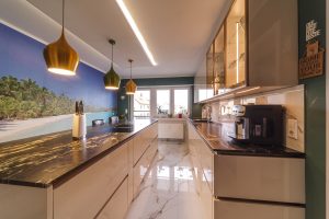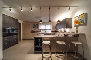 Aufgabe: Die neu gestaltetet Küche erhält einen hellen, glänzenden Boden. Dazu möchte der Kunde eine große Kochinsel mit Sitzplatz. Herausforderung dabei ist der lange, schlauchförmige Raum. Viel Stauraum steht im Vordergrund und der vorhandene Kühlschrank soll integriert werden.