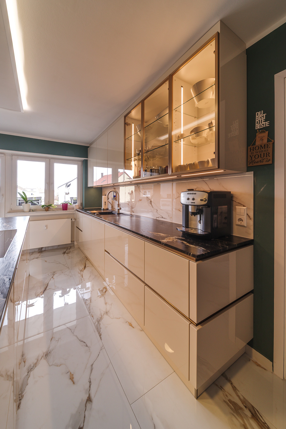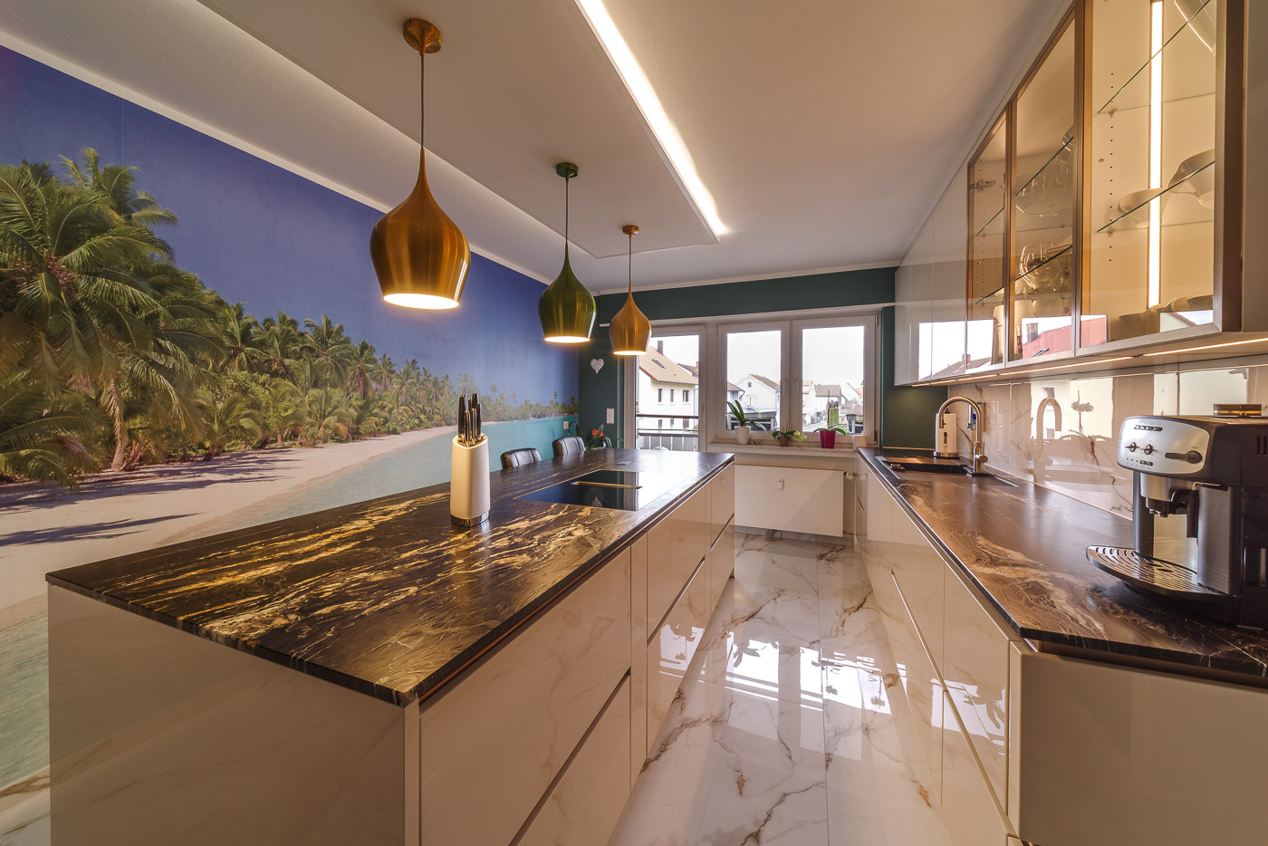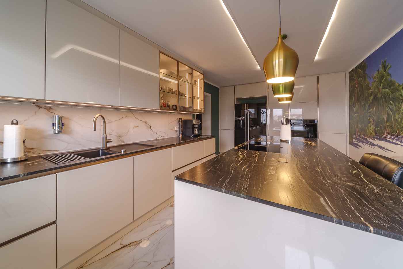 Aufgabe: Die neu gestaltetet Küche erhält einen hellen, glänzenden Boden. Dazu möchte der Kunde eine große Kochinsel mit Sitzplatz. Herausforderung dabei ist der lange, schlauchförmige Raum. Viel Stauraum steht im Vordergrund und der vorhandene Kühlschrank soll integriert werden.