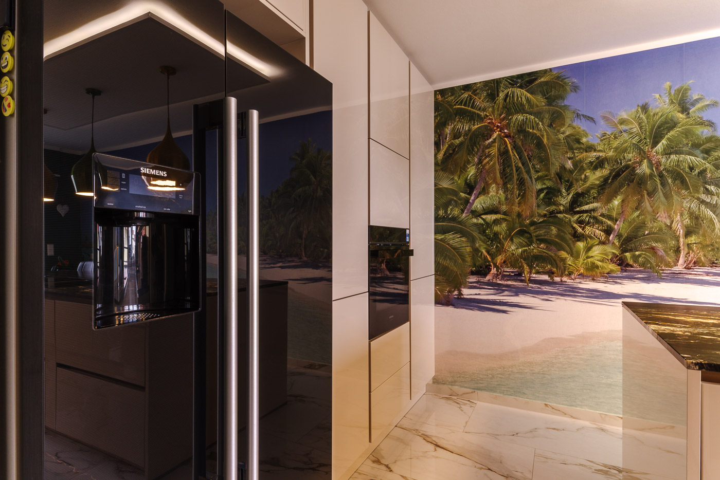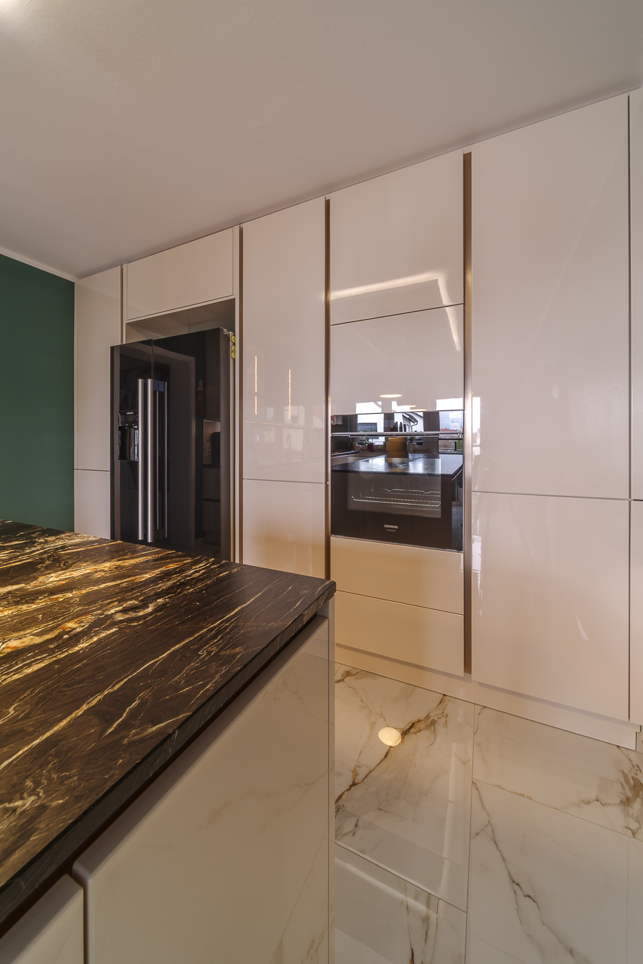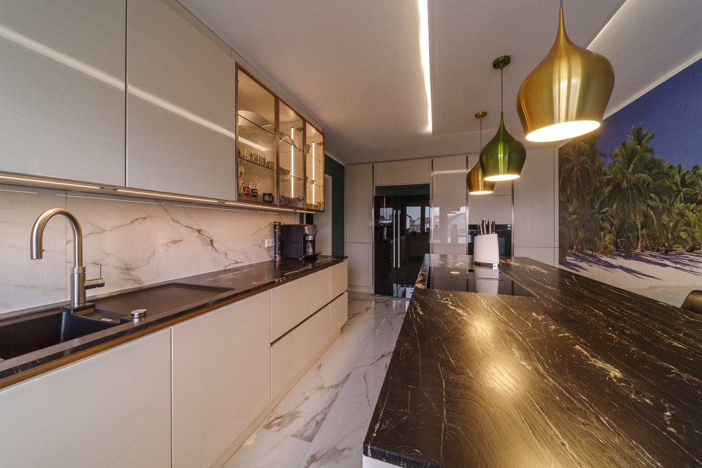 Aufgabe: Die neu gestaltetet Küche erhält einen hellen, glänzenden Boden. Dazu möchte der Kunde eine große Kochinsel mit Sitzplatz. Herausforderung dabei ist der lange, schlauchförmige Raum. Viel Stauraum steht im Vordergrund und der vorhandene Kühlschrank soll integriert werden.