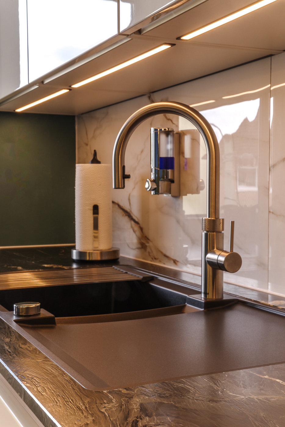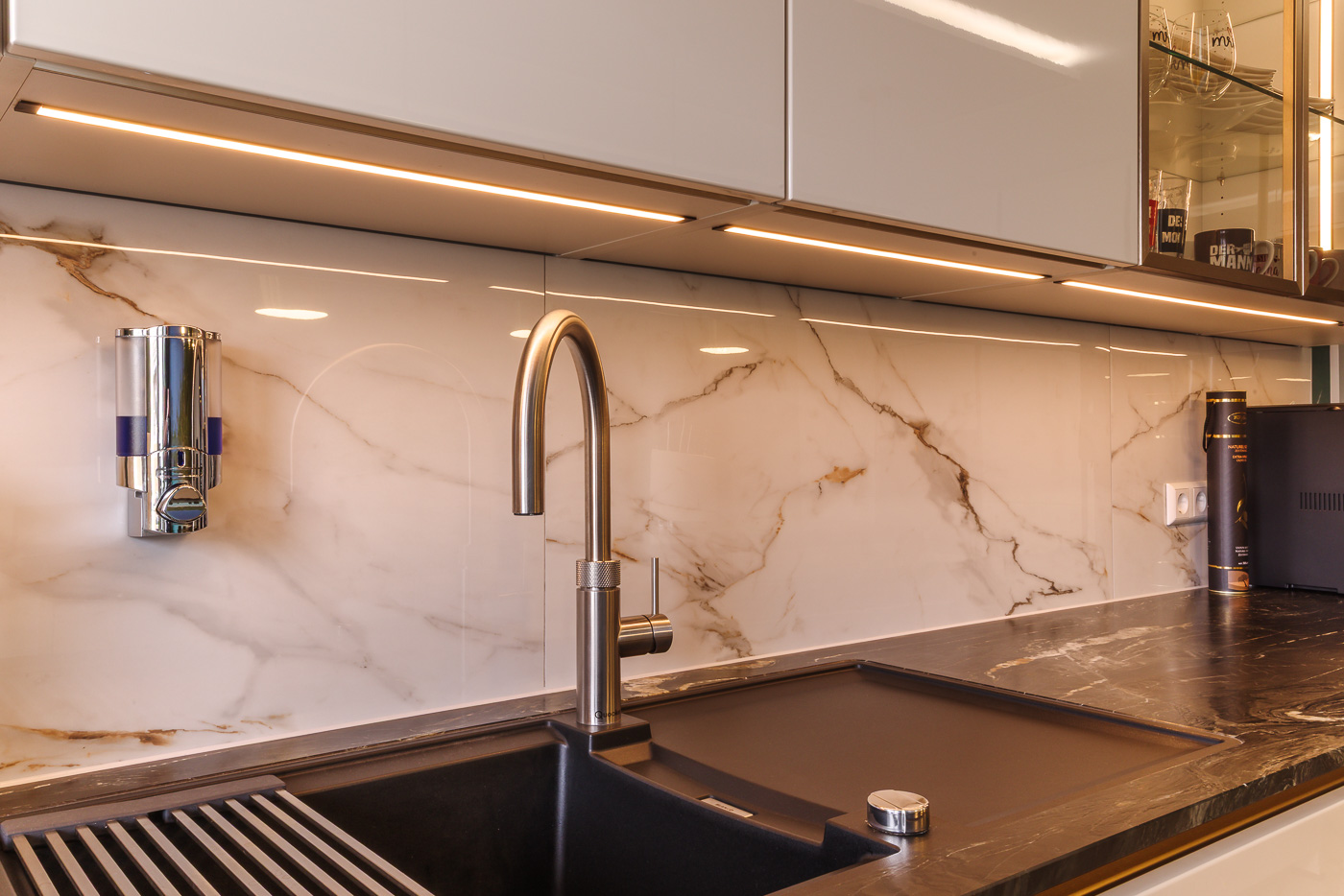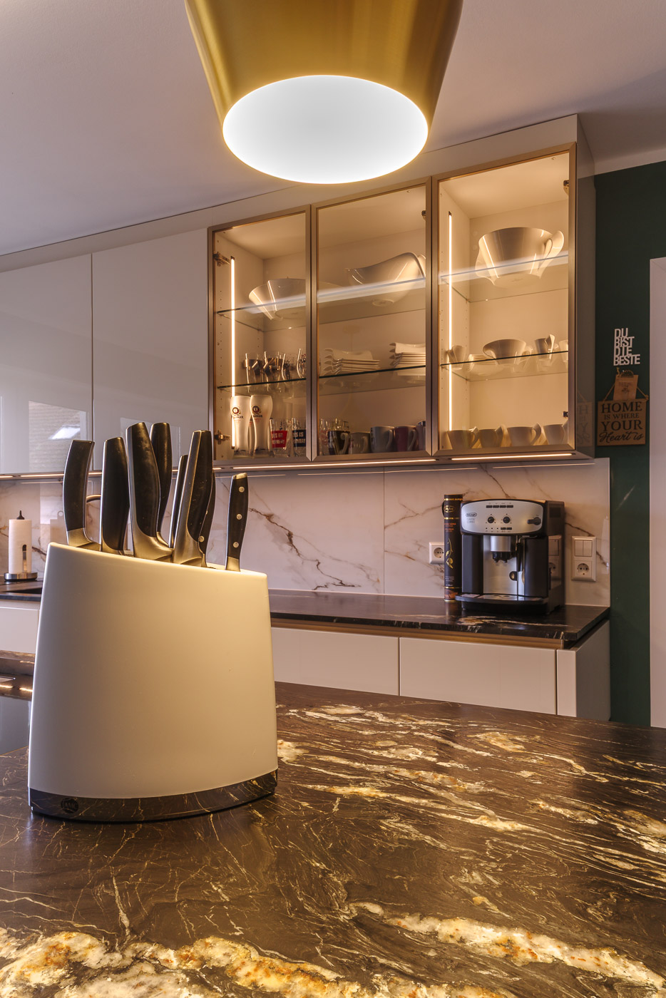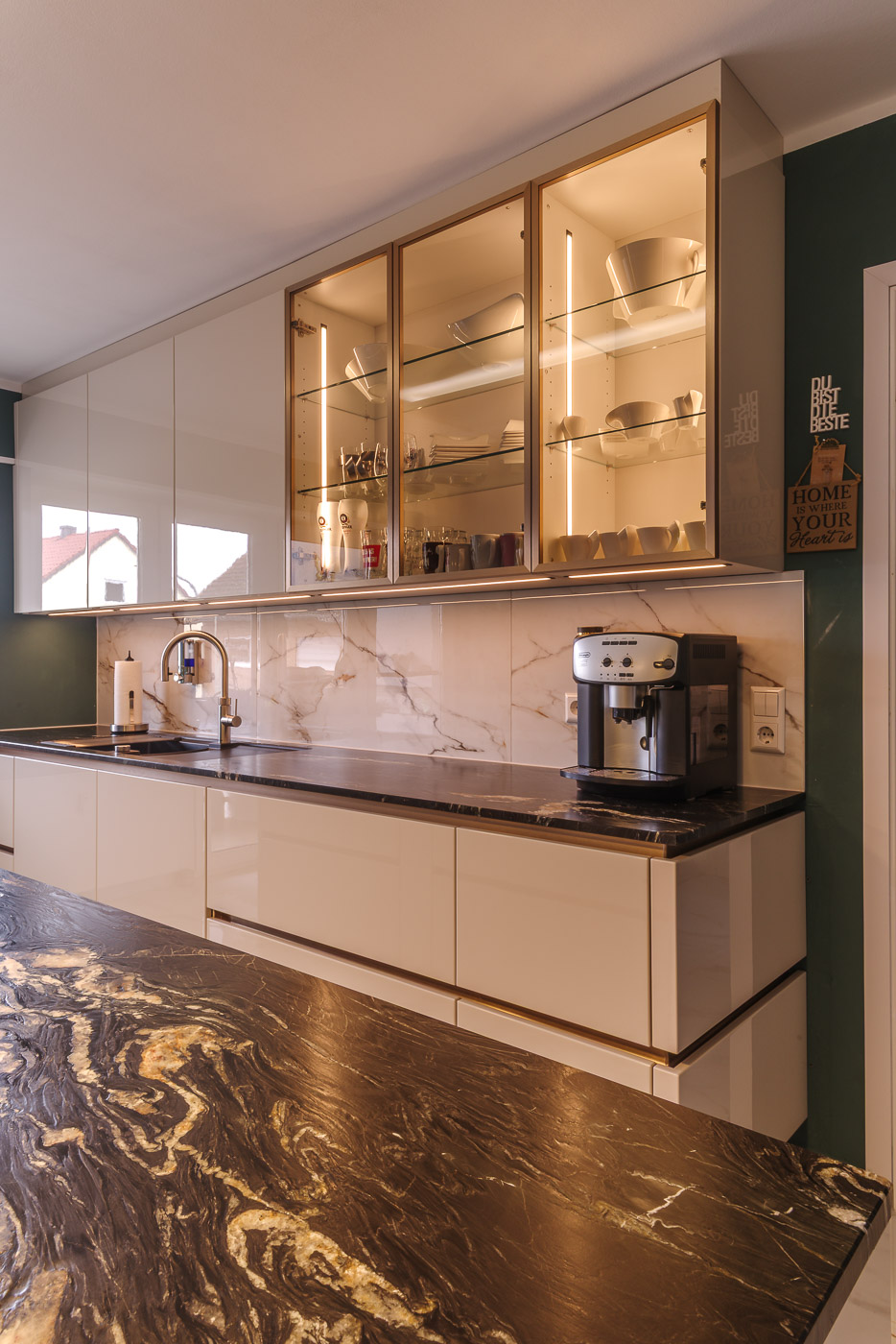 Wünsche: Kochinsel, helle, grifflose Front, Essplatz für 2 Personen. Naturstein Arbeitsplatte ohne Trennung.